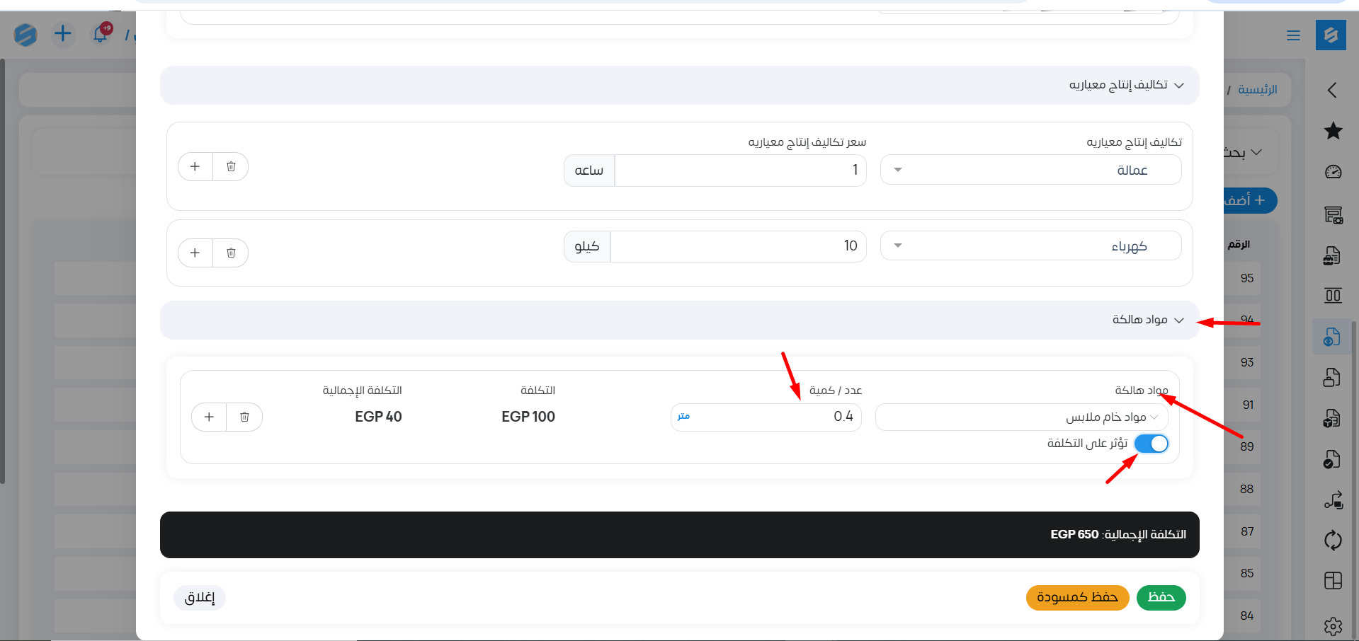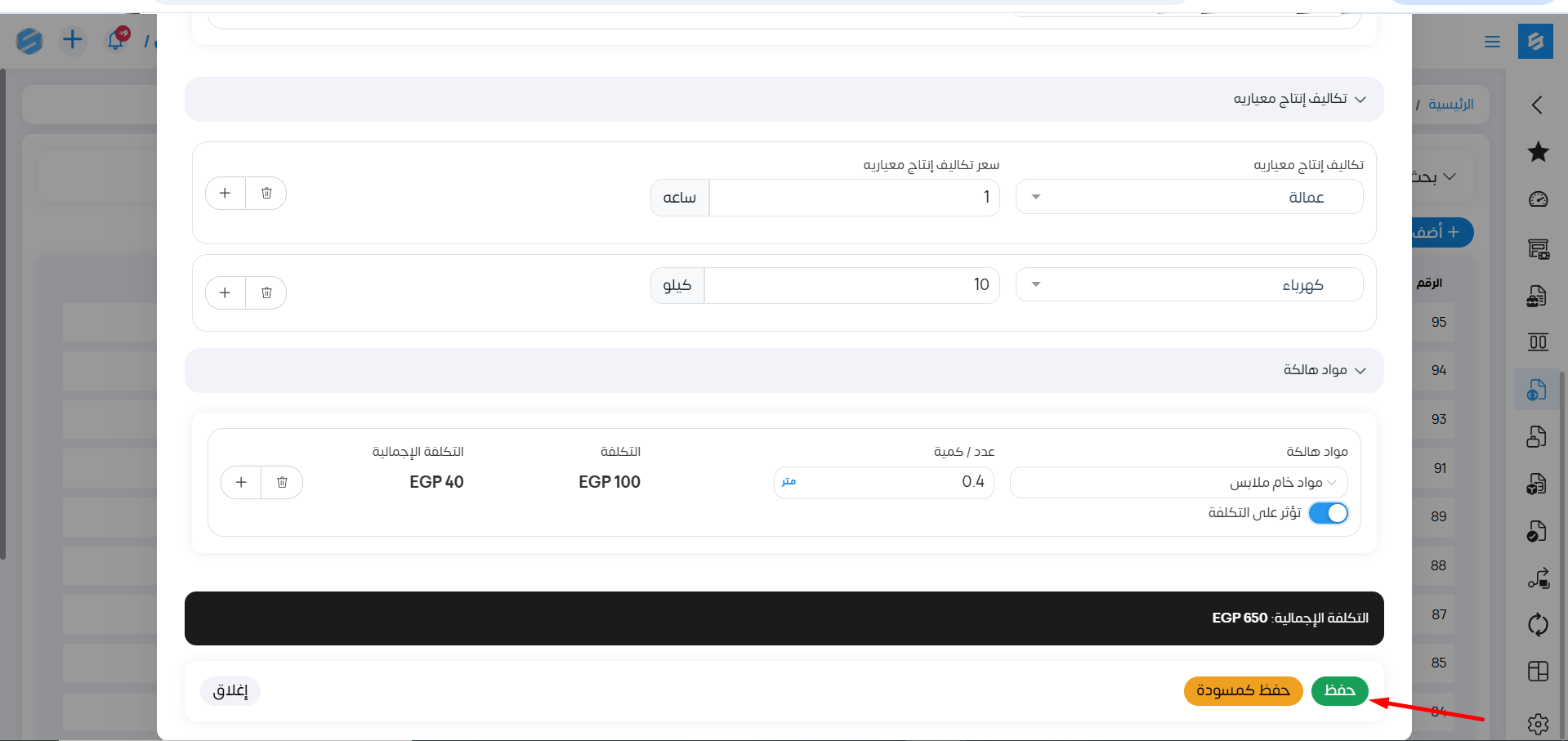 بعد اضافة جميع التفاصيل تظهر لنا تكلفة إجمالية والتي ستكون تكلفة الوحدة الواحدة من الصنف بعد إنتاجه.