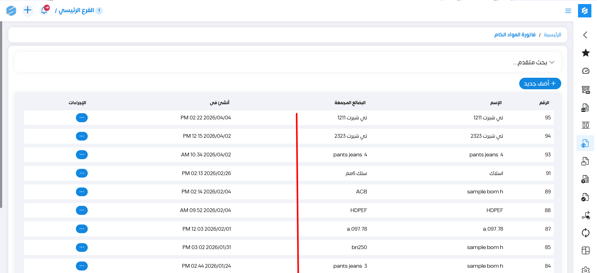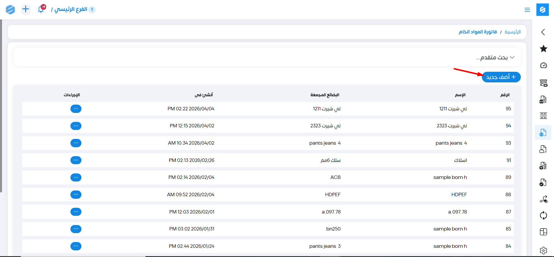 لإنشاء فاتورة مواد خام لصنف جديد لم يتم عمل فاتورة مواد خام له من قبل نقوم بالضغط على أضف جديد: