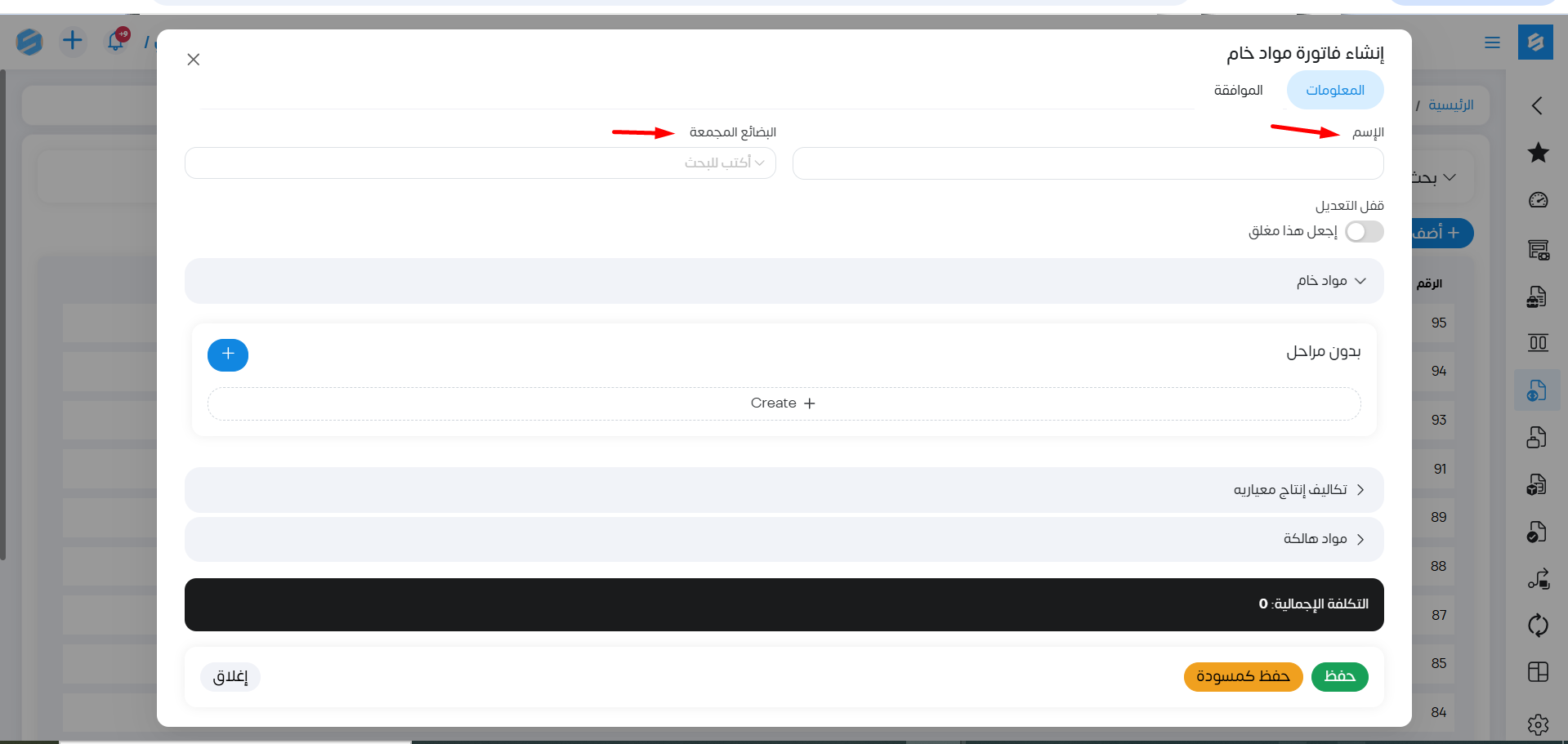 نقوم بتسجيل إسم فاتورة المواد الخام، ونقوم بتحديد البضائع المجمعة وهو الصنف المراد عمل فاتورة مواد خام له.