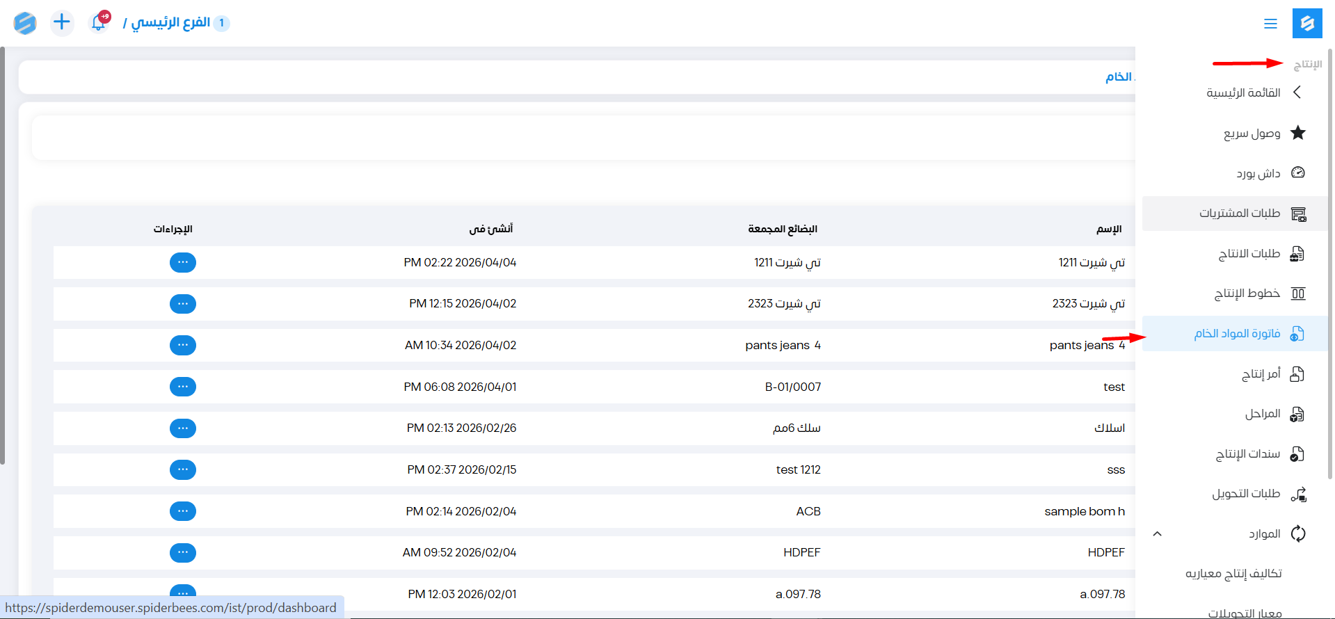 عند الدخول إلى موديول الإنتاج ثم فاتورة المواد خام.