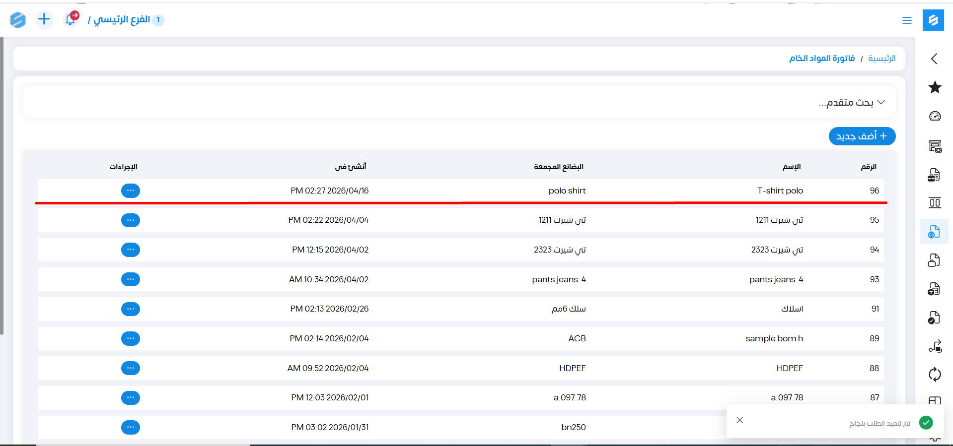 #ملاحظة: لا يمكننا إنشاء اكثر من فاتورة مواد خام لنفس الصنف .
