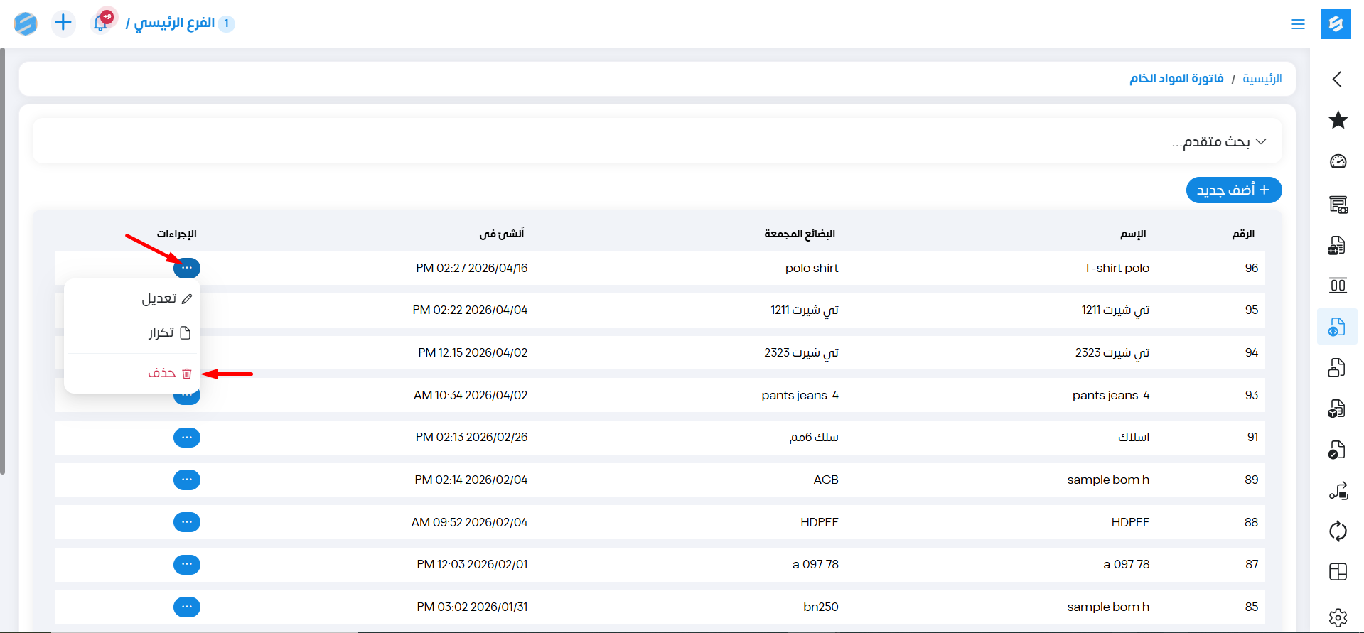 حذف فاتورة المواد الخام