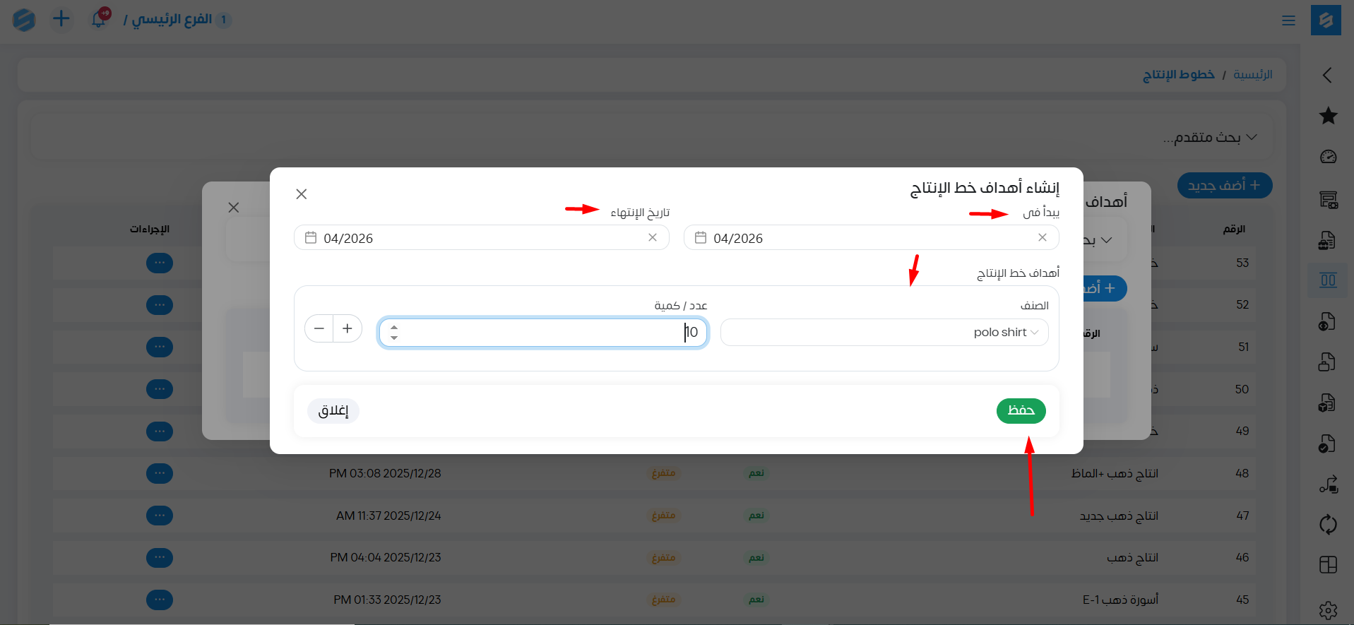 ثم نقوم بتحديد تاريخ البدء والإنتهاء لهذا الهدف بالشهور، وتحديد الهدف الخاص بالاصناف.