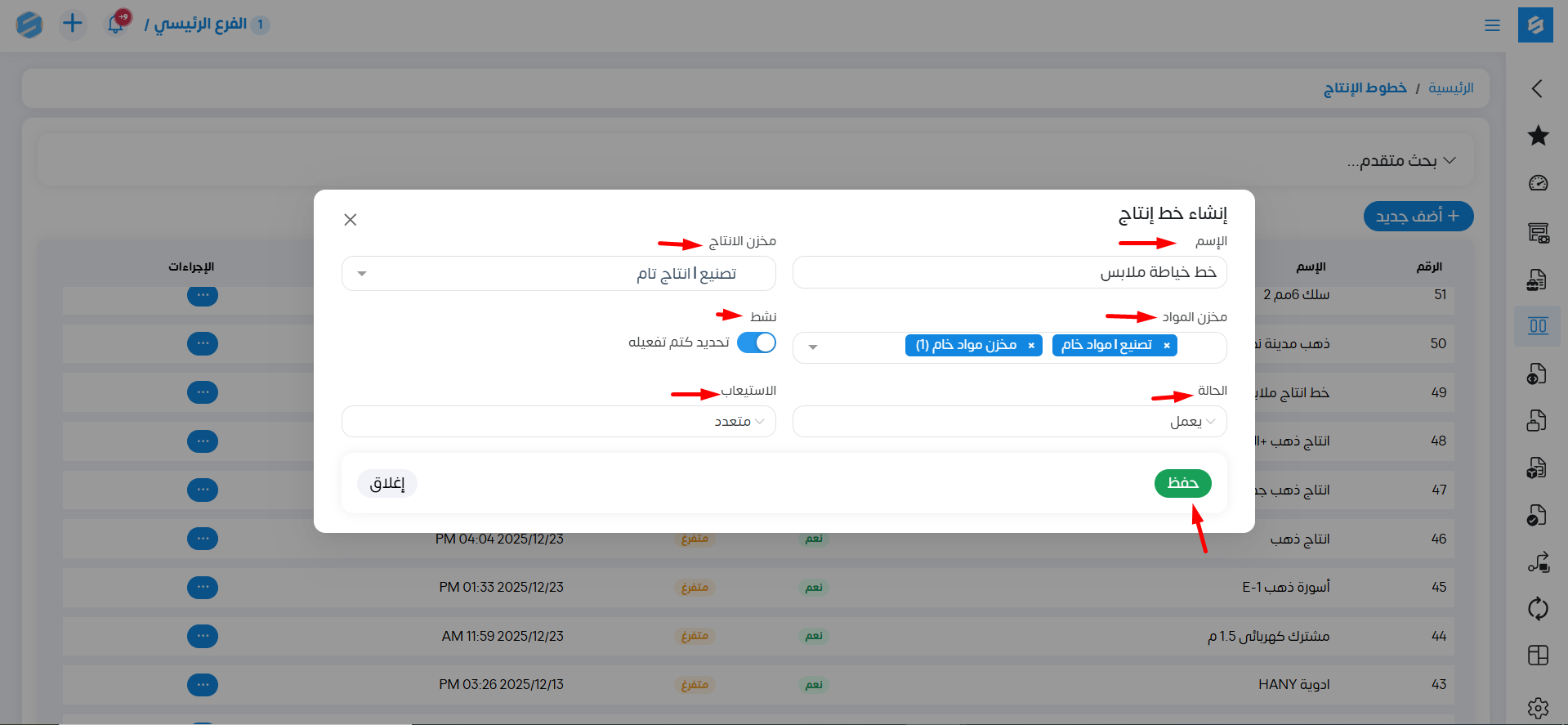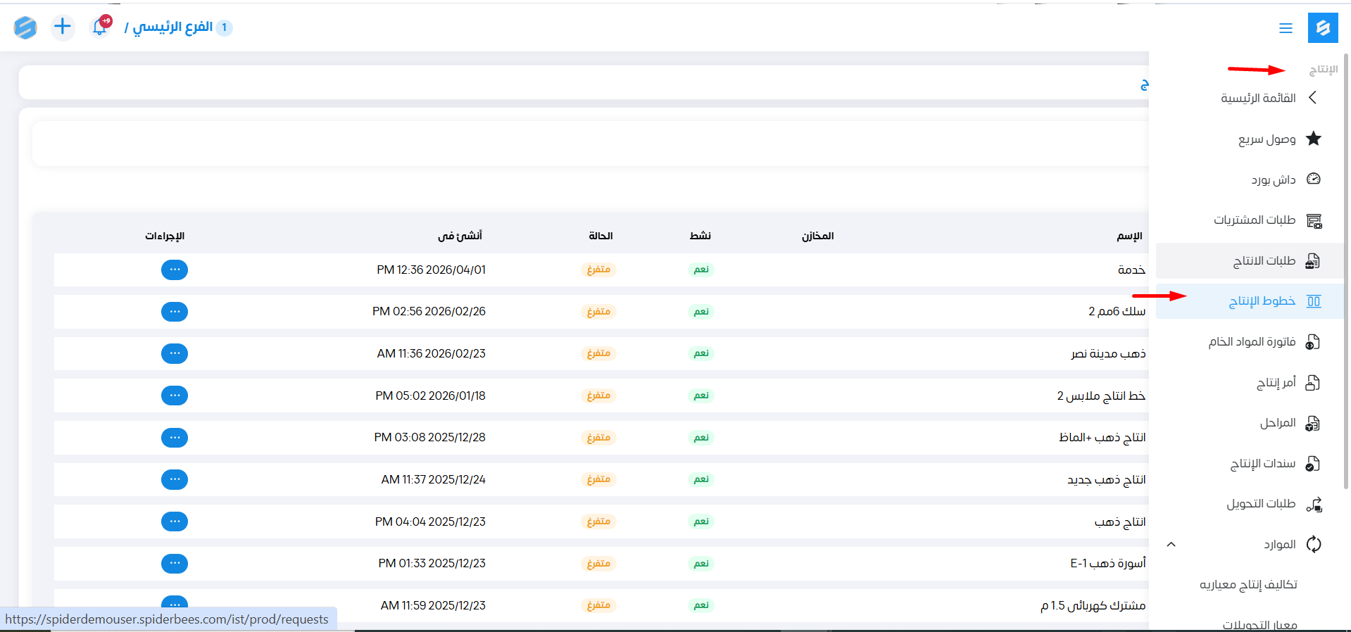 عند الدخول إلى موديول الإنتاج ثم خطوط الإنتاج.