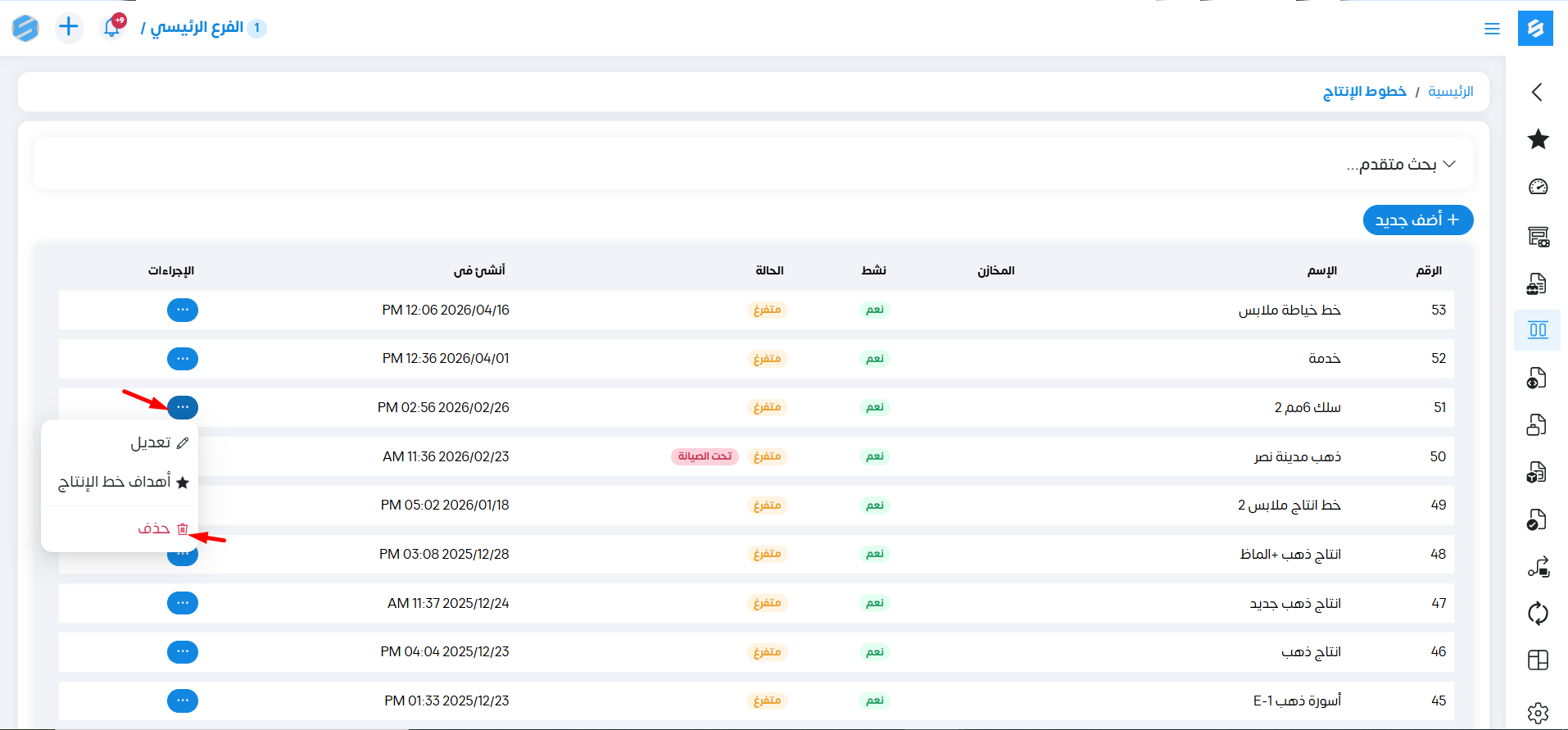 يمكننا حذف خط الإنتاج كالتالي: