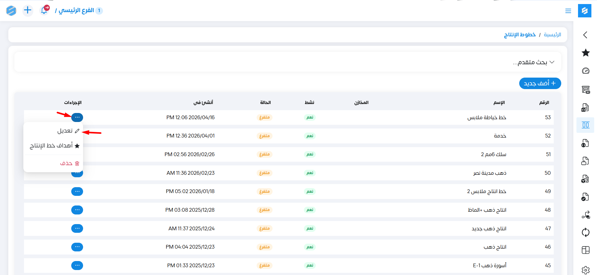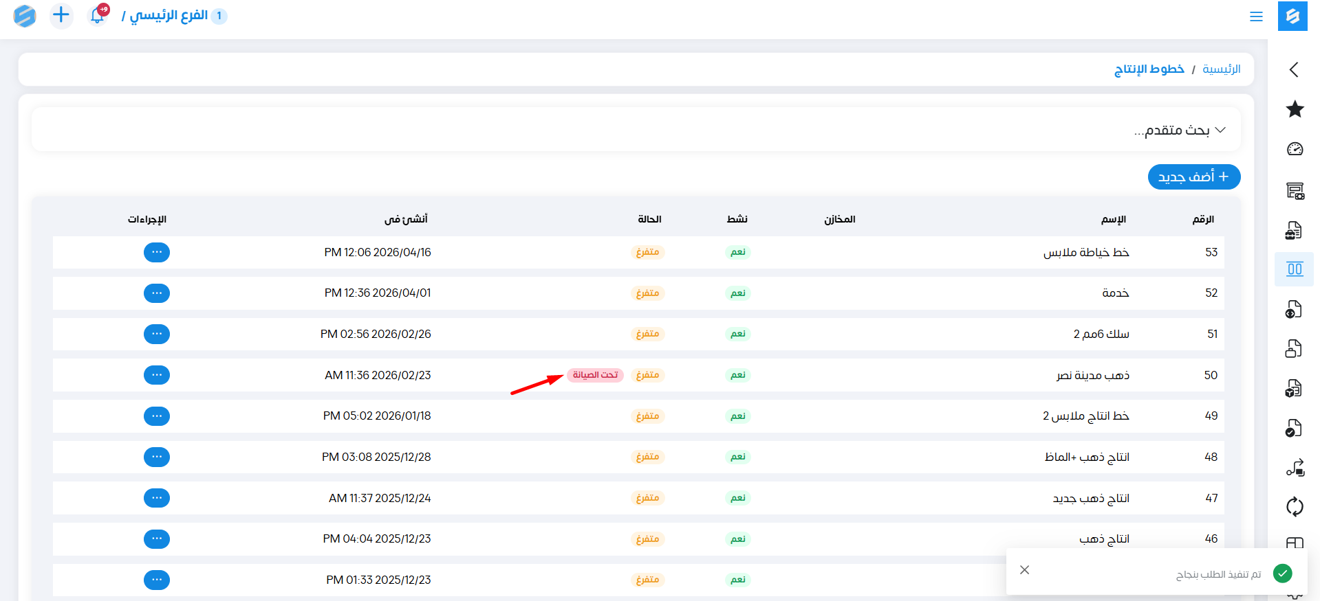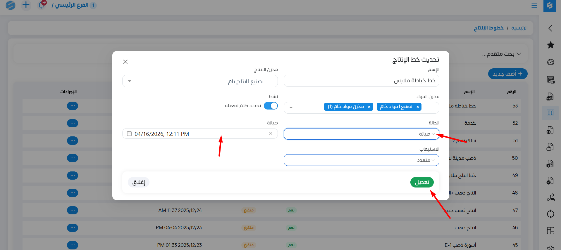 فنستطيع تغيير بياناته مثلاً في حالة تعطل خط الإنتاج نغير حالته إلى صيانة.