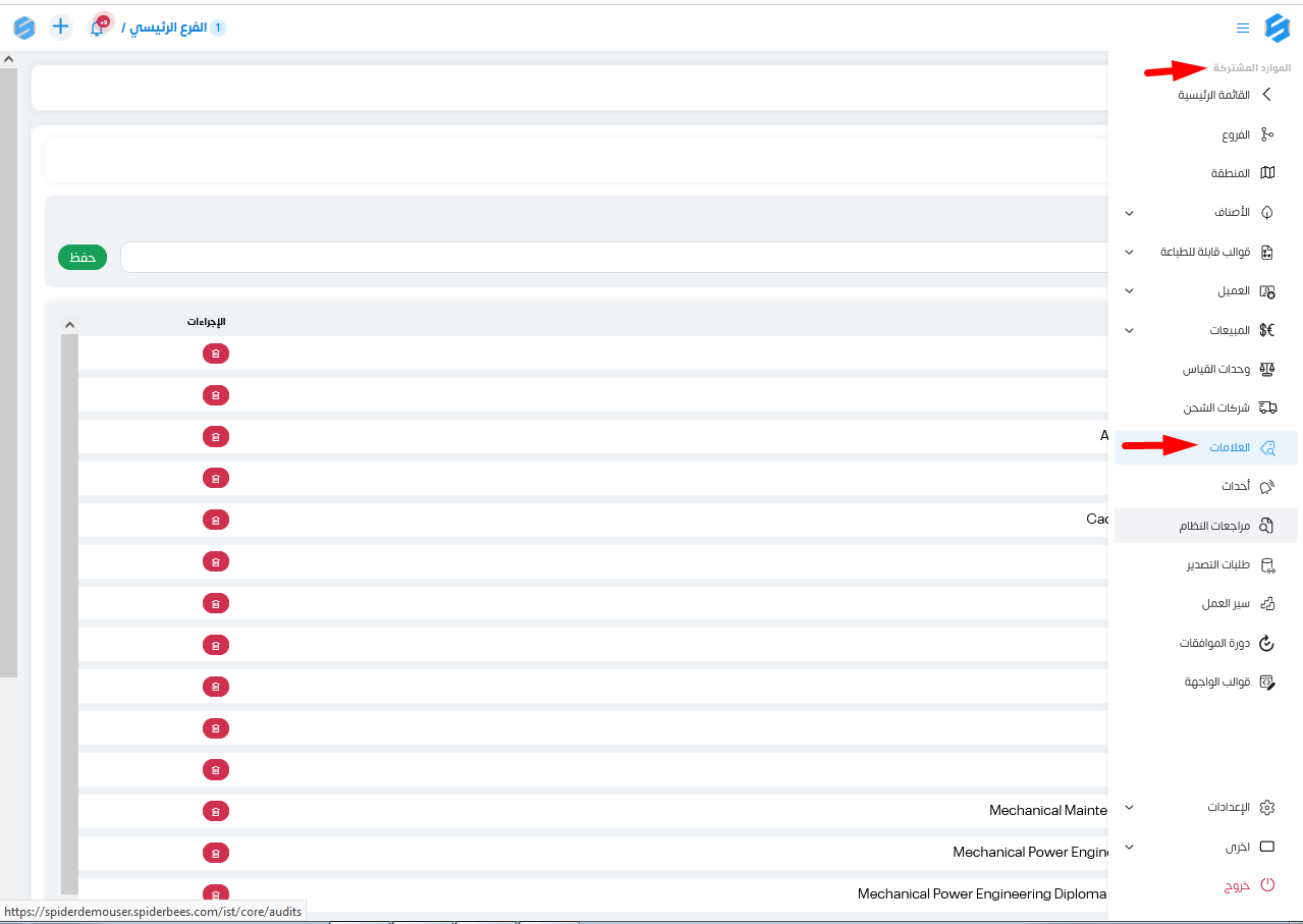 من القائمة الخاصة بالموارد المشتركة يتم الدخول على العلامات . وذلك من حساب الادمن . أو المسؤل الذى لديه صلاحيات إضافة العلامات .