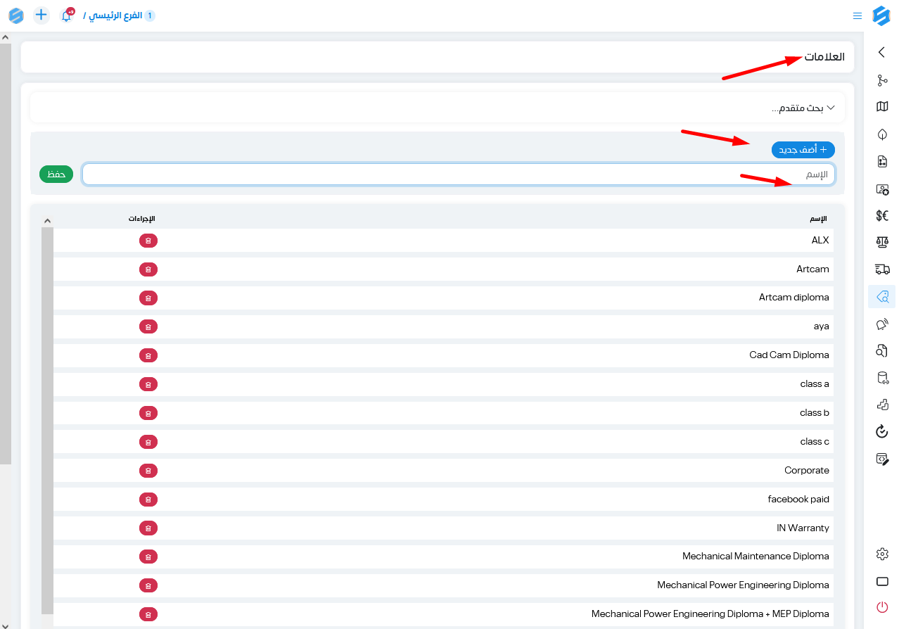 لتسجيل علامة جديدة . يتم الضغط على أضف جديد ومن ثم تسجيل إسم العلامة . والضغط على حفظ .
