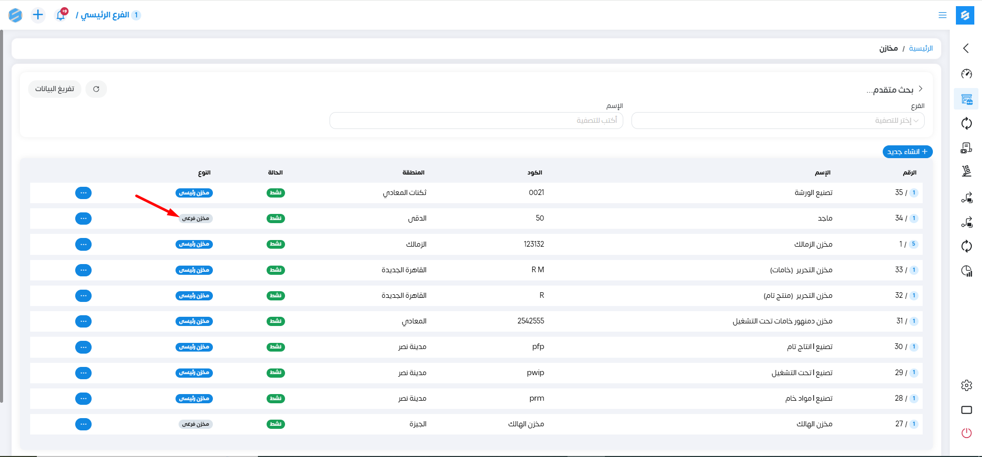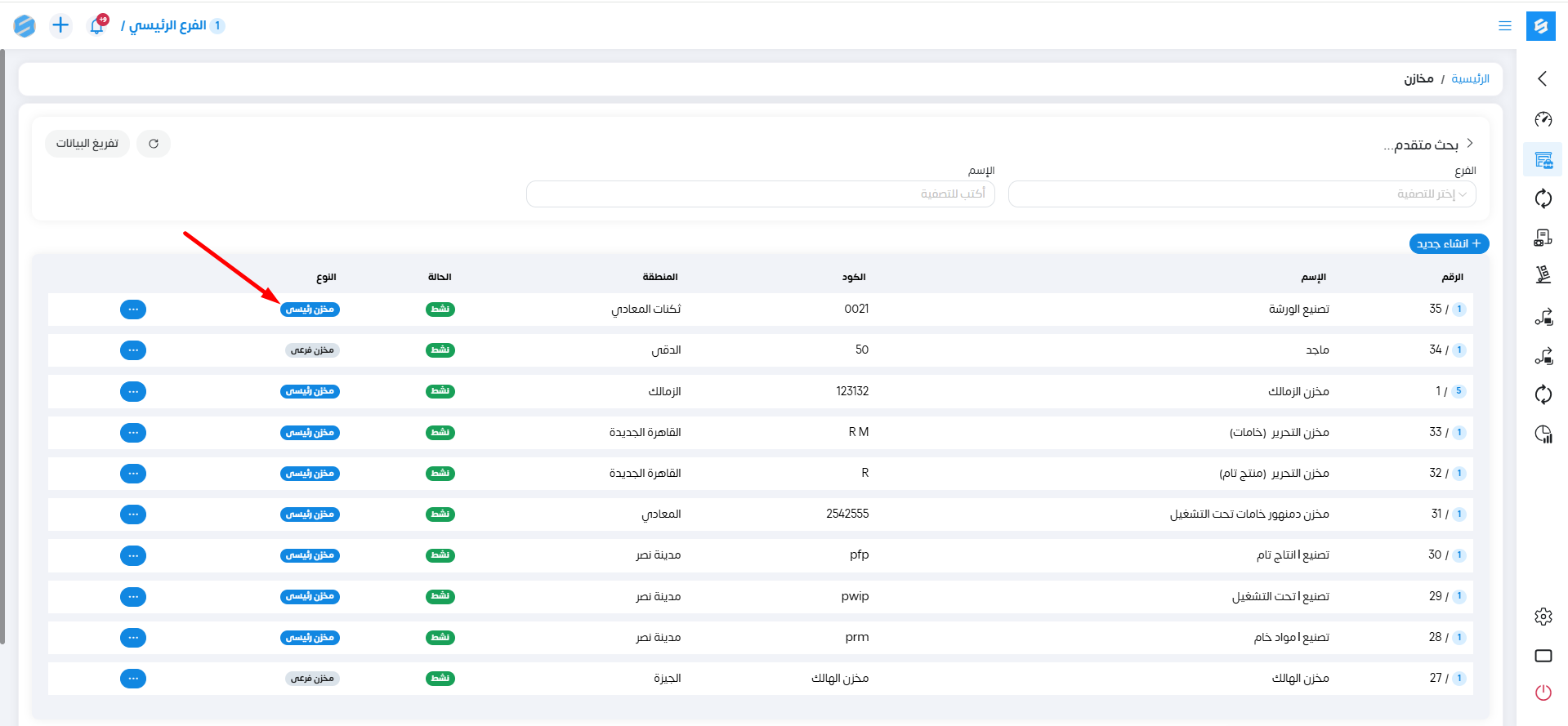 1-مخزن رئيسي : هذا النوع من المخازن هو النوع الذي يمكننا عمل كل الحركات عليه ويكون هو المسئول عن استقبال البضائع من الموردين.