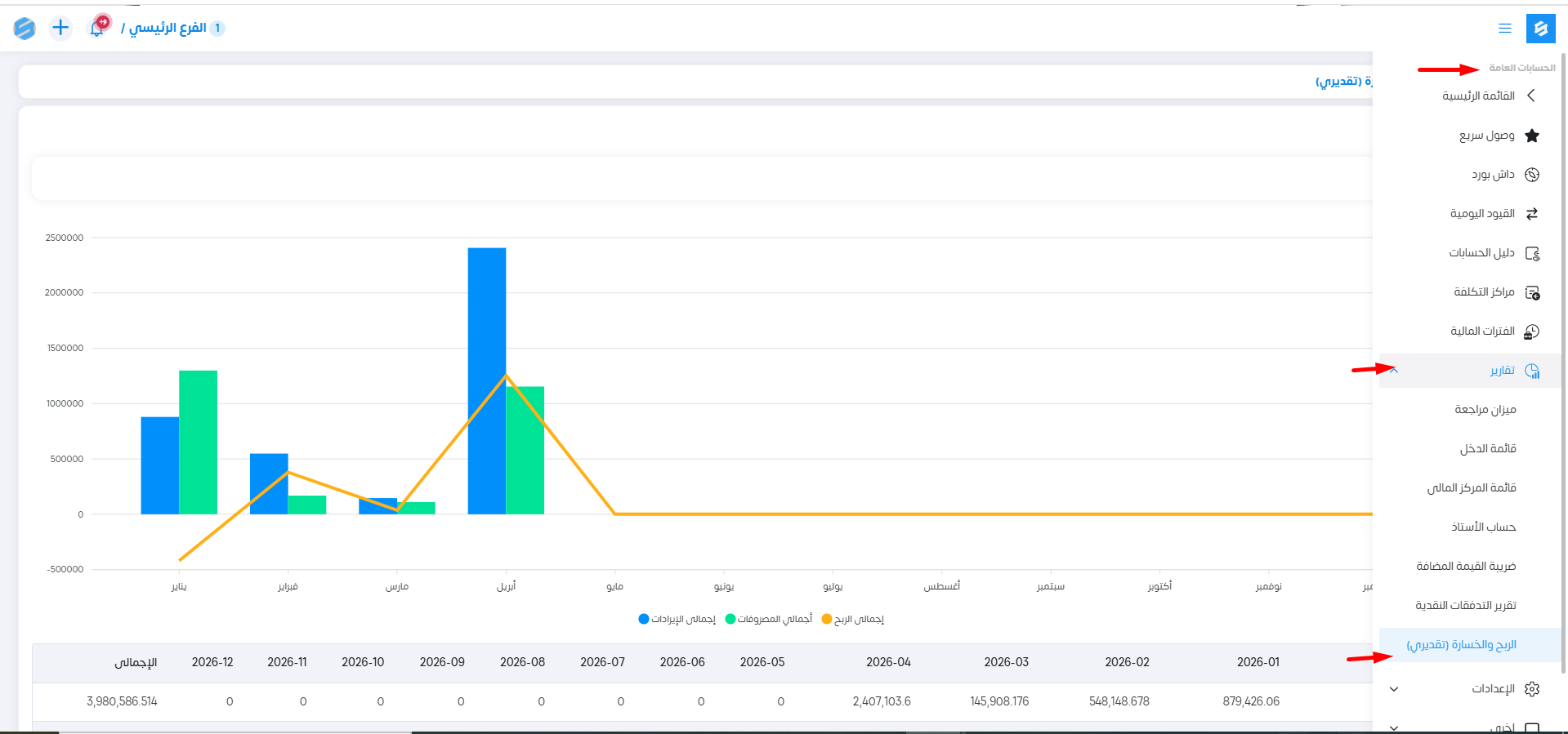 يوضح لنا هذا التقرير: إجمالى الربح بناء على العمليات المحاسبية التى تمت من خلال الحسابات المختلفة .