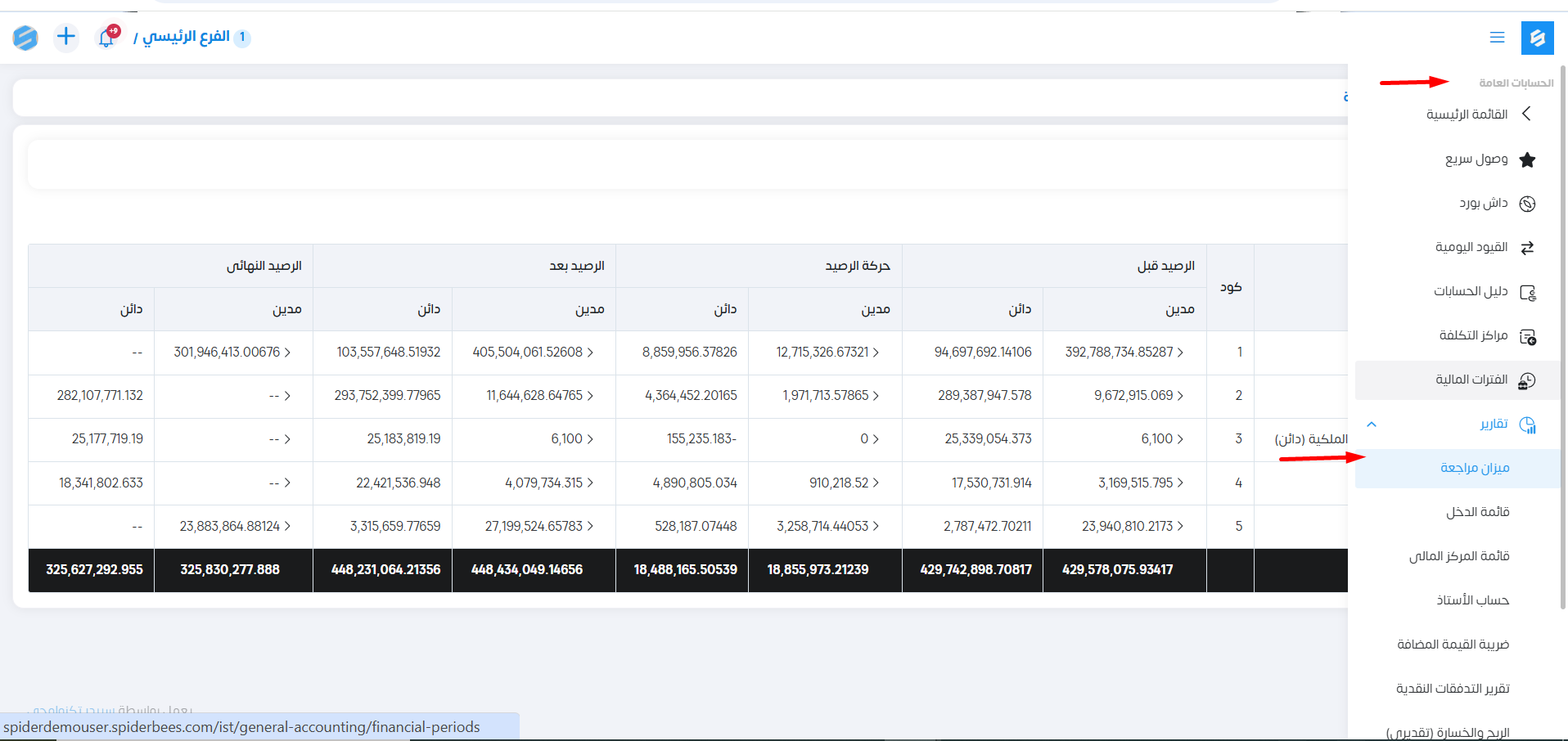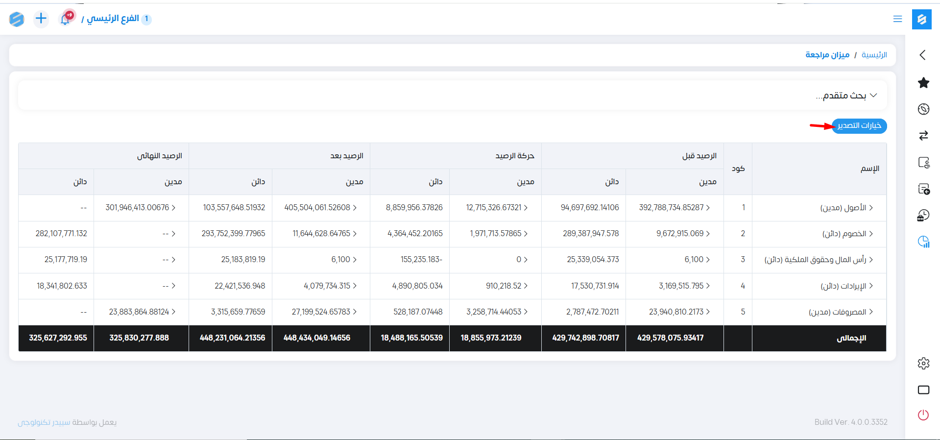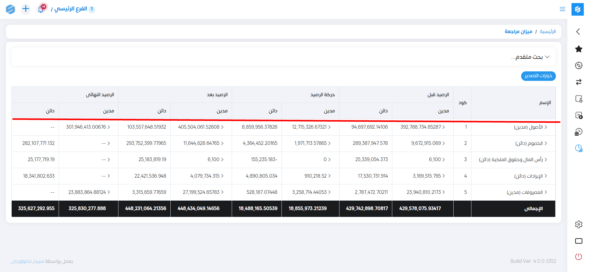 إسم الحساب، الرصيد قبل، حركة الرصيد، الرصيد بعد، الرصيد النهائى.