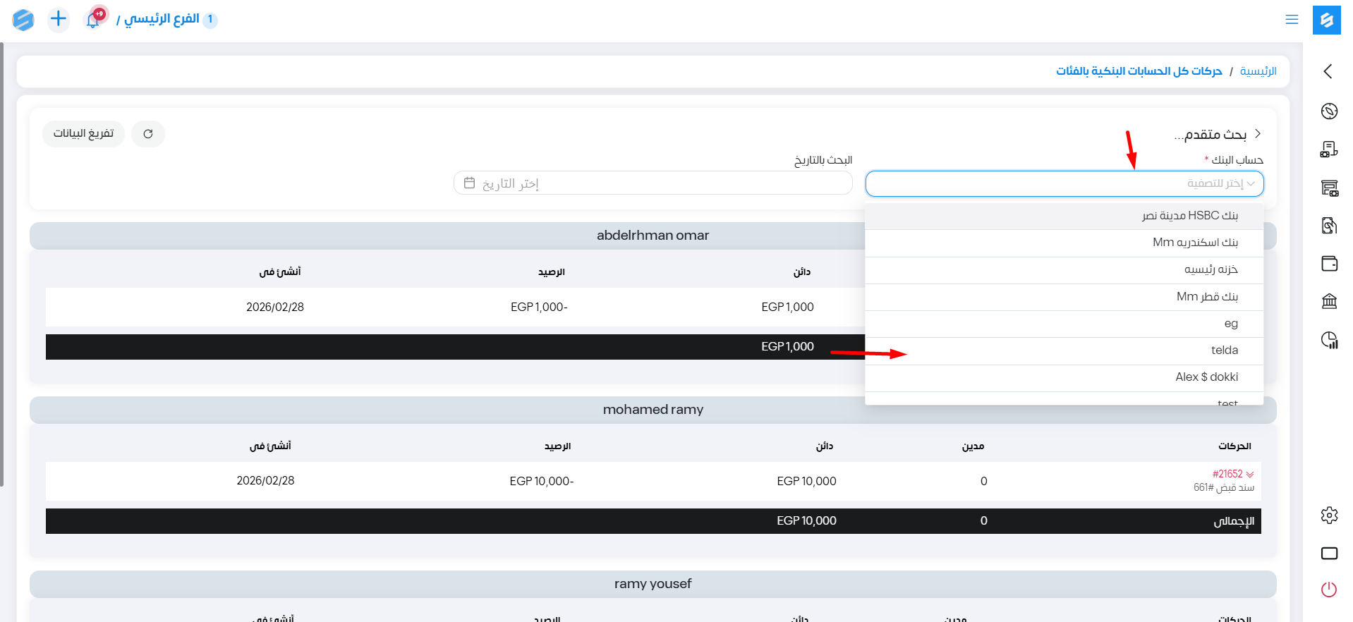 عند إختيار حساب بنكي في البحث في هذا التقرير يوضح التفاصيل التالية: