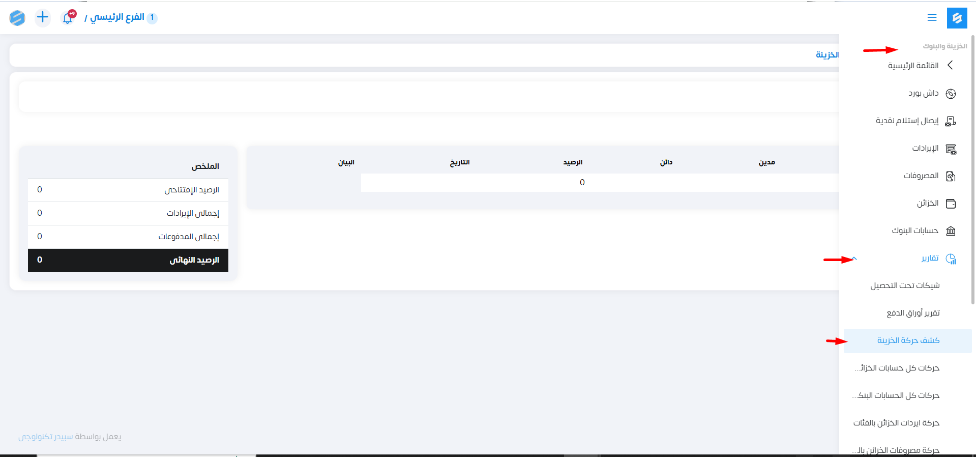 ملخص جانبي يوضح: الرصيد الإفتتاحي، إجمالي الإيرادات، إجمالي المدفوعات، الرصيد النهائي.