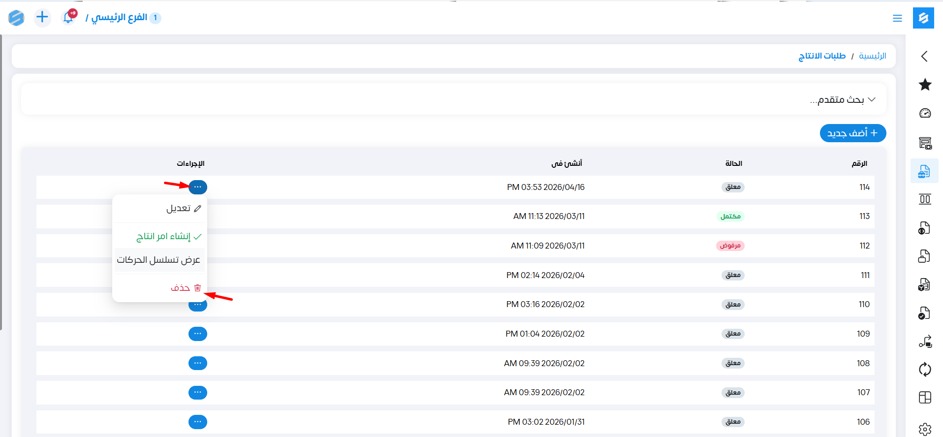 يمكننا حذف طلبات الإنتاج كالتالي: