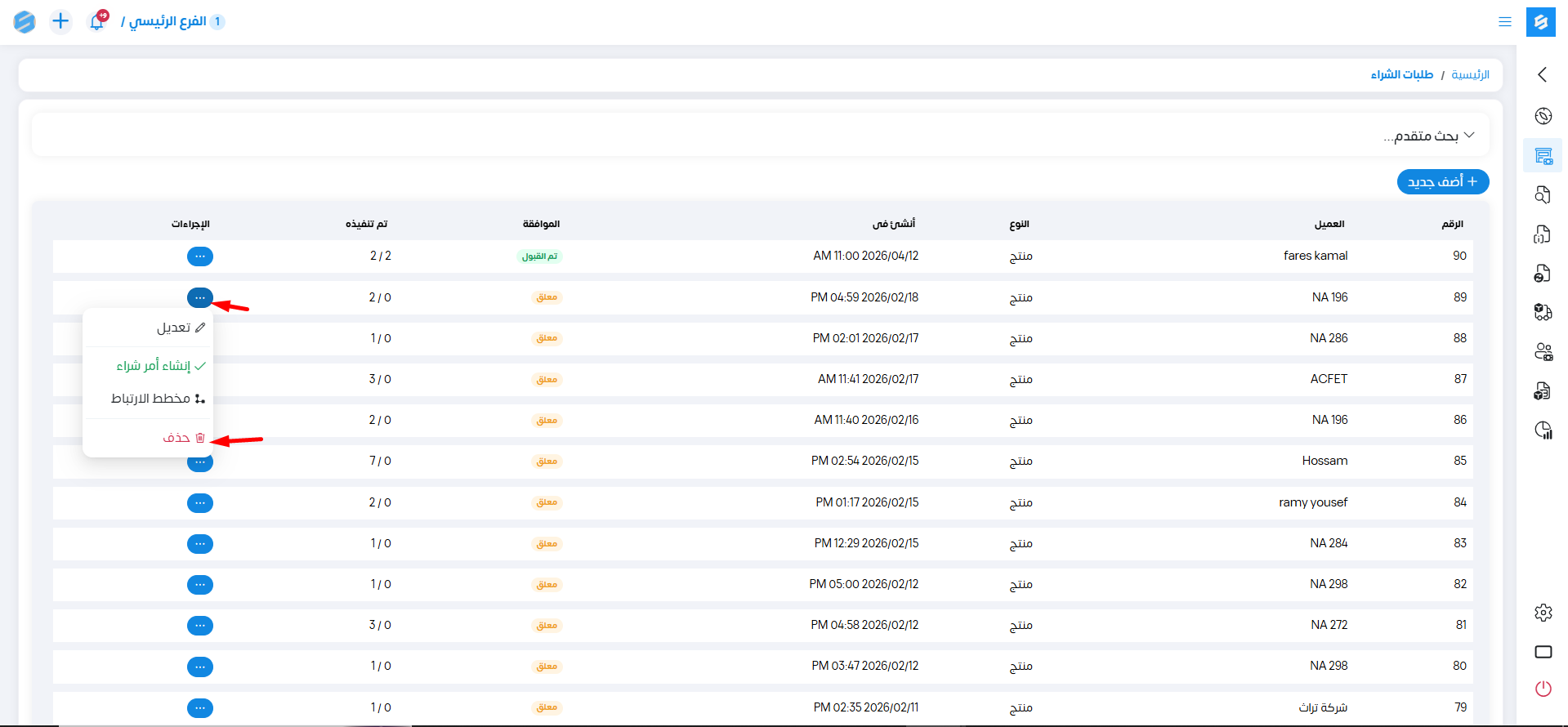 نستطيع حذف طلبات المشتريات.
